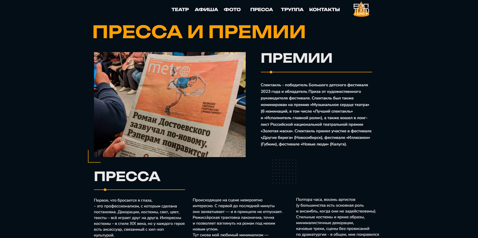 Для Театра я разработал логотип, афиши, сайт. И поучаствовал в оформление сцены и реквизита.