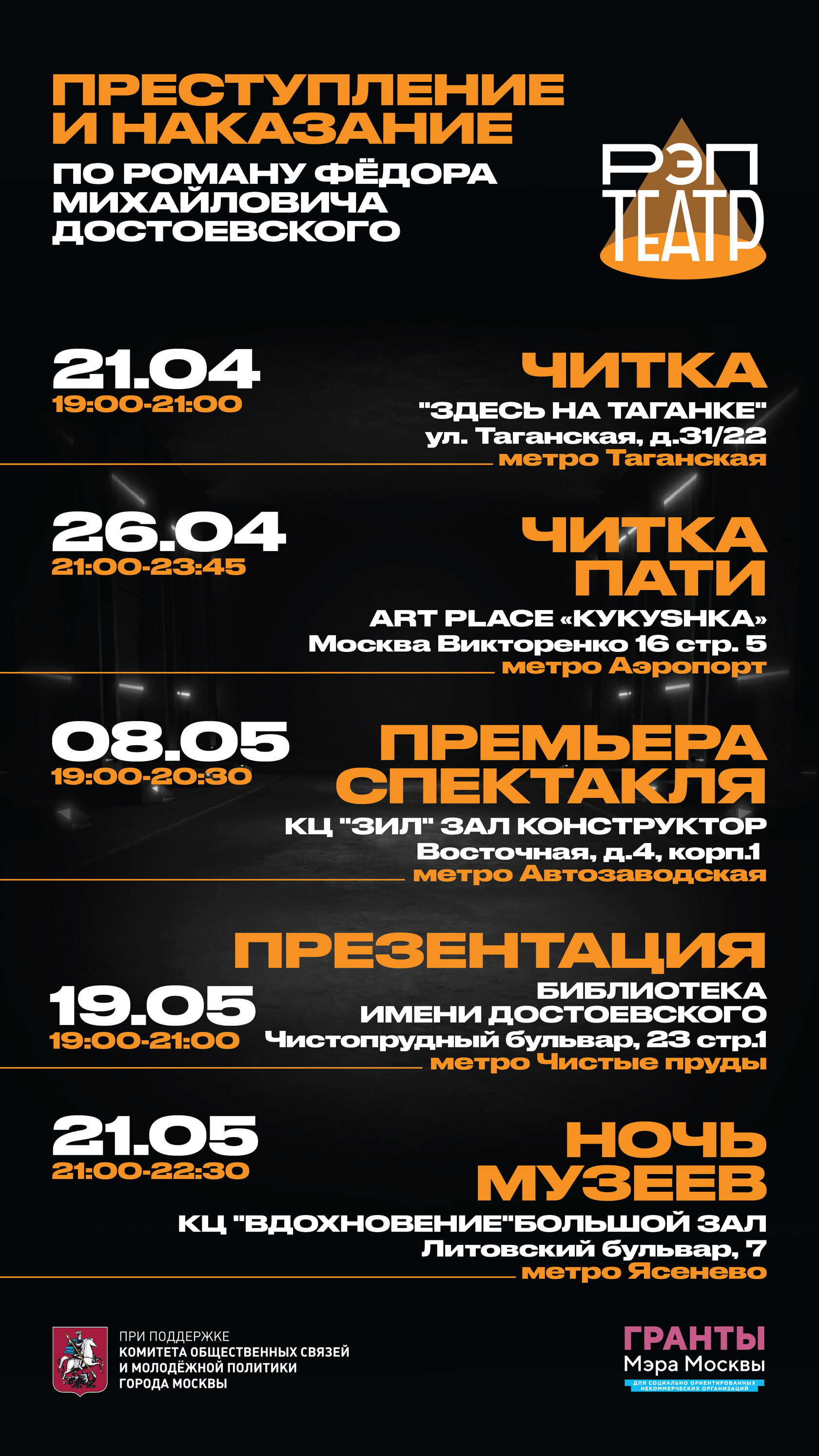 Рэп-театр это театральная группа, которая поставила два мюзикла по произведениямФ.М. Достаевского «Преступление и наказание» и «Идиот», сейчас работают над новым спектаклем. Дебютный спектакль проекта «Рэп- театр»,победитель гранта Мэра Москвы 2022.